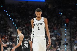 上半场比赛,文班出战17分50秒,4投1中,得到2分5篮板2助攻2盖帽,出现2失误3犯规,正负值-6。