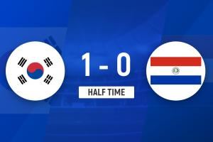第15分钟,韩国队取得领先,巴拉圭球员禁区解围变成乌龙助攻,严智星扫射破门,韩国队1-0领先巴拉圭队。↓