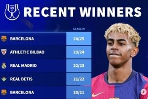 体育资讯10月29日讯 《转会市场》统计了近10年国王杯夺冠情况,巴萨5次夺冠居首。