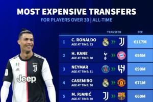 体育资讯10月29日讯 德转盘点了足坛历史30岁及以上球员转会费纪录榜,其中C罗33岁加盟尤文以1.17亿欧居首,凯恩加盟拜仁次席,内马尔9000万欧第三。